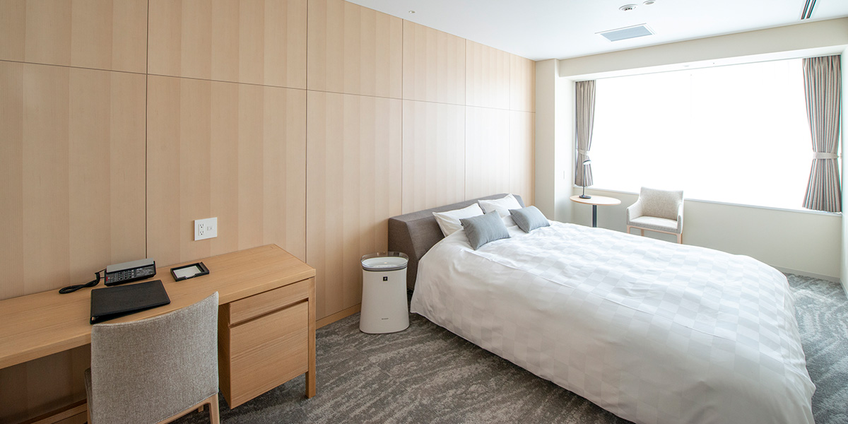 2020年4月にオープンした宿泊室は、全183室。シングルでも25m2を確保したくつろぎのゆったりスペースです。バス・トイレ別、クローゼットや荷物置き場も充実した仕様で、長期滞在でも快適にお過ごしいただけます。